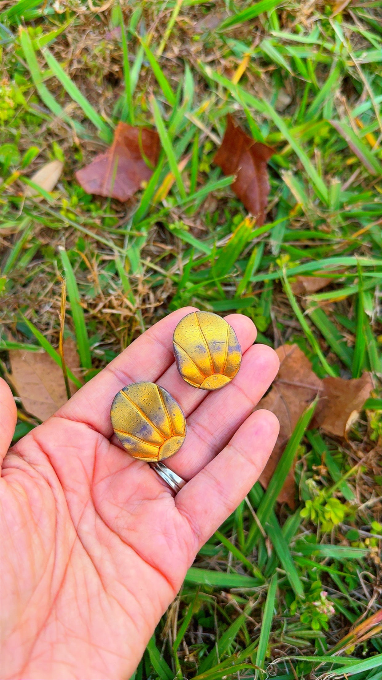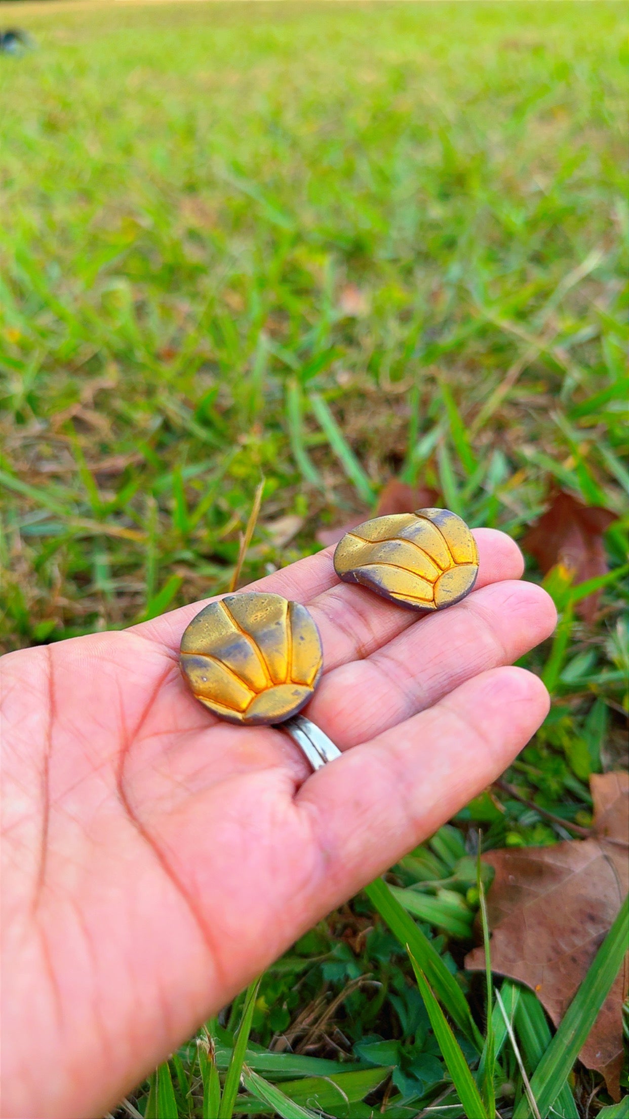 These hand-sculpted clay earrings capture the beauty of a warm sunset you can wear. Each stud features rich golden tones that fade into soft bronze shading, creating the look of a glowing sun sinking beneath the horizon. Textured lines radiate outward like natural sunrays, giving every pair a warm, earthy glow.