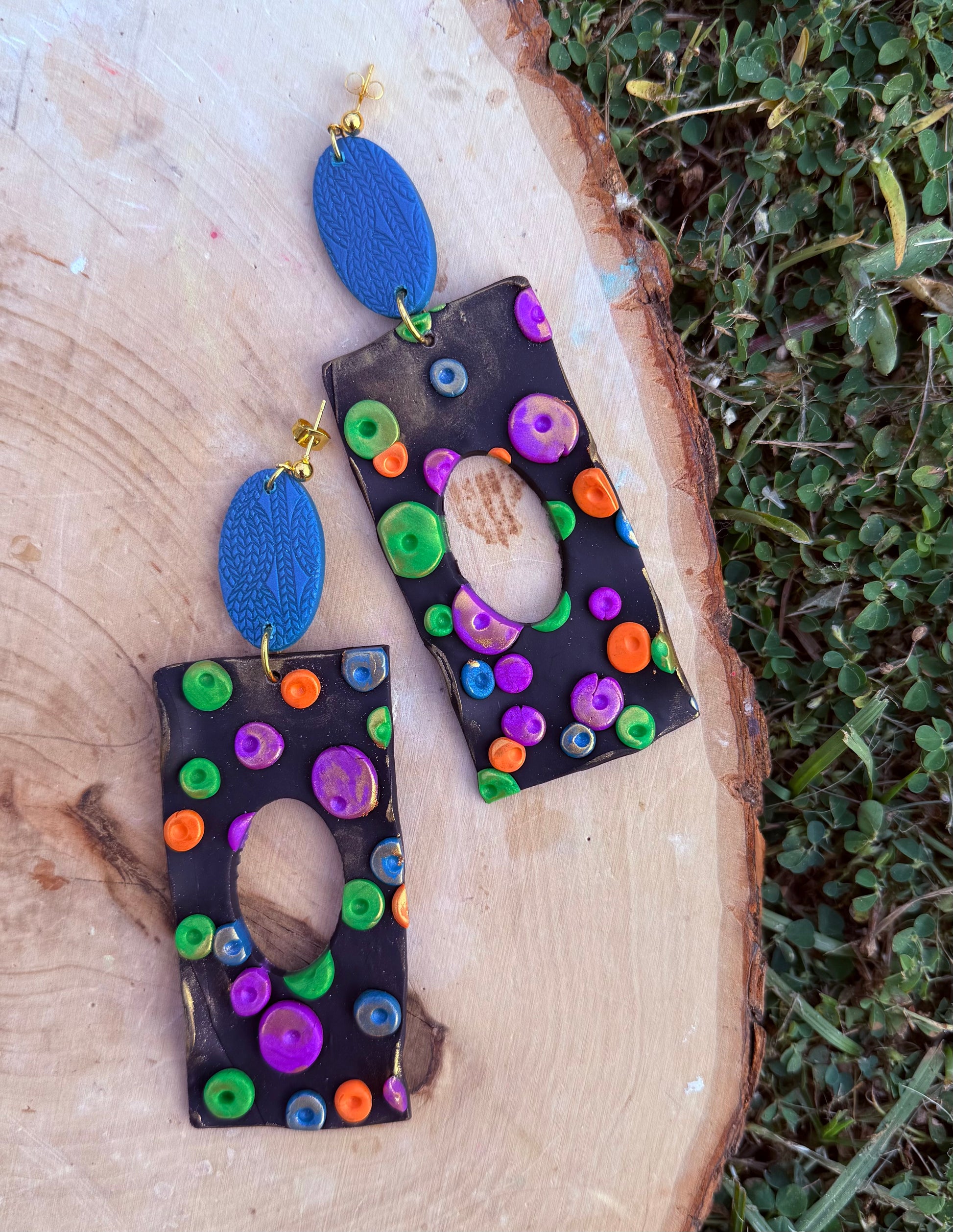 Fun, fearless, and full of color — Zaria is made for the woman who doesn’t blend in. These striking black statement earrings feature random, hand-placed polka dots in purple, orange, teal, and green, creating a bold burst of playful energy.
