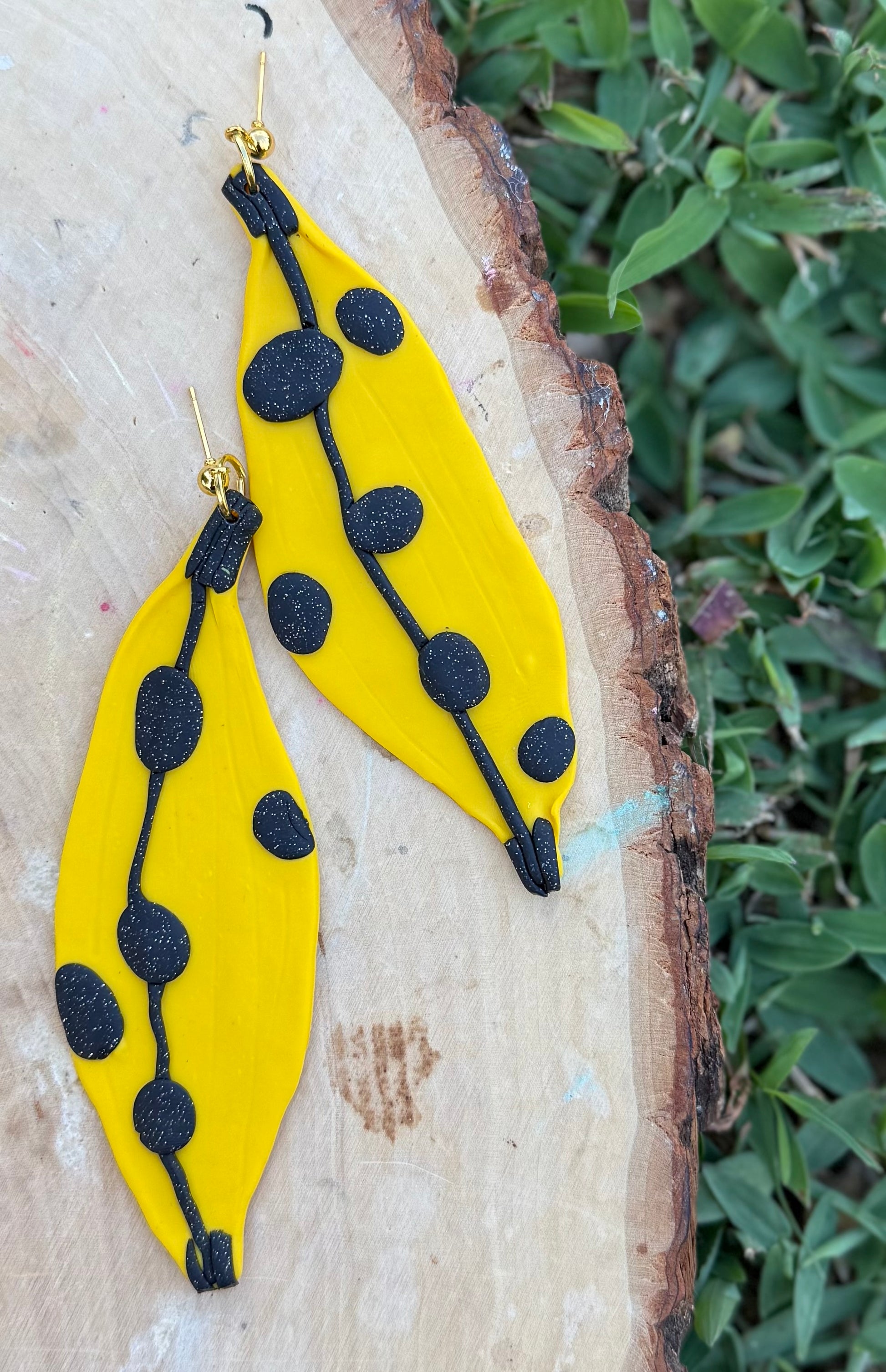 Bright, bold, and artistic—these earrings are shaped like elongated yellow leaves with bold black dotted details running through the center. A statement piece that brings art and nature together.